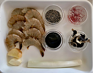 素材名:海老 黒木耳 黒胡麻 大蒜 生姜 葱白