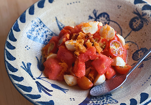 トマトはヘタを取り、種の部分を取り除いてすいか同様1㎝くらいの角切りにします。 |