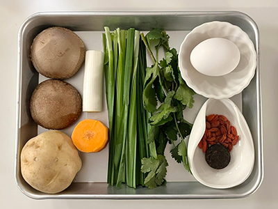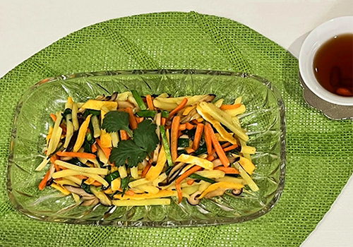 黒胡麻油をフライパンに引いて葱を入れ中火で焦げないように炒め香りが出てきたら、じゃが芋、にんじん、椎茸の順に入れて火を通したら韮を入れ塩で味付け後香菜を入れ、最後に千切りした玉子を入れる。 |