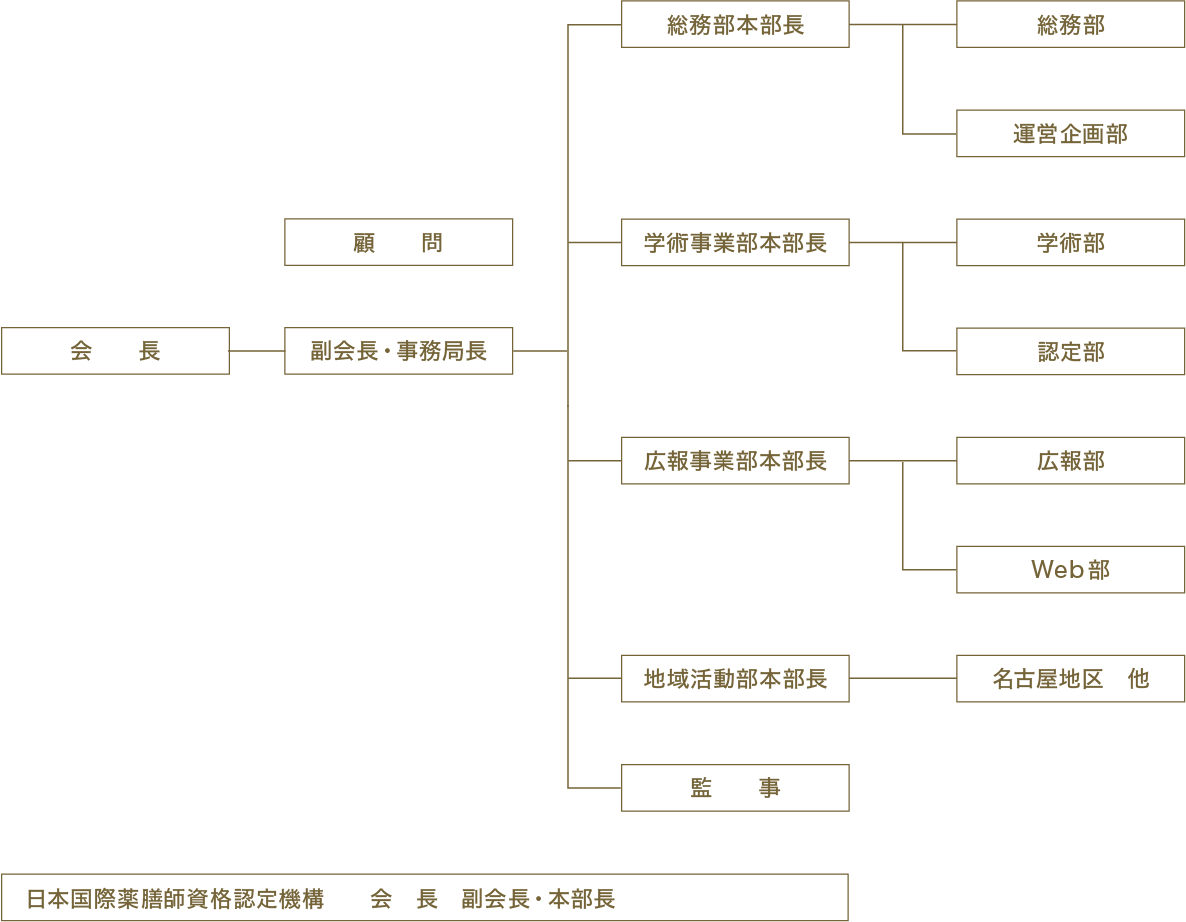 一般社団法人日本国際薬膳師会は会長を中心に総務部本部、学術事業部本部、広報事業部本部、地域活動部本部で構成され、総務部、運営企画部、学術部、認定部、広報部、Web部がそれぞれ役割を担って活動しています。また、隔月に1回開催される理事会にて逐次意見を交換し、柔軟かつダイナミックな組織運営を行っています。